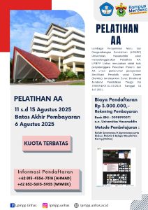 Divisi Pengembangan Kurikulum dan Pembelajaran, Lembaga Penjaminan Mutu dan Pengembangan Pendidikan (LPMPP) Universitas Hasanuddin akan melaksanakan Pelatihan Peningkatan Keterampilan Dasar Teknik Instruksional (PEKERTI) bagi dosen umum yang rencananya akan dilaksanakan pada tanggal tanggal 23 s.d. 28 September 2024, pendaftaran kami buka mulai tanggal 16 Agustus s.d. 20 Spetember 2024. Untuk Informasi dapat menghubungi kontak person: Widya Asnita (085256155955) dan Muhammad Ahmad (081343567318). Jumlah minimum peserta 25 orang, jadwal sewaktu-waktu berubah bila jumlah minimum peserta tidak terpenuhi